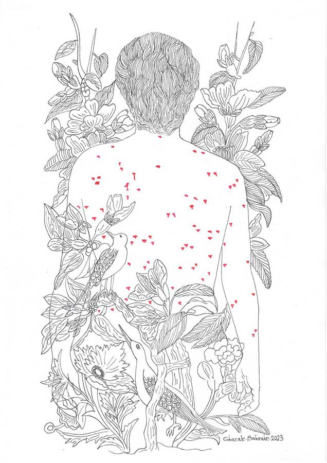 La série que j’expose ici a vu le jour après la création de ma propre collection sur la Maternité, qui a eu pour point de départ le décès de Mahsa (Zhina) Amini en 2022. Une insurrection sans précédent a éclaté en Iran depuis la révolution de 1979. Bien que je n’aie pas été physiquement présente lors de cette manifestation, j’ai participé depuis Lyon au mouvement « Femme, Vie, Liberté ». Mon statut d’artiste et de mère m’a permis de m’identifier aux mamans dont les enfants sont morts, blessés ou emprisonnés, de m’associer à leur deuil, et de leur exprimer mon empathie. Par ma démarche et mon implication, je tiens à honorer tous les héros du quotidien qui ont collaboré à cette révolte. Mon engagement s’inscrit dans mes œuvres, où je rends compte de ma propre opinion et de mon expérience vécue. Cette « présence » révélée au monde à travers des signes iconiques confère à mes réalisations une puissance et un sens symboliques.