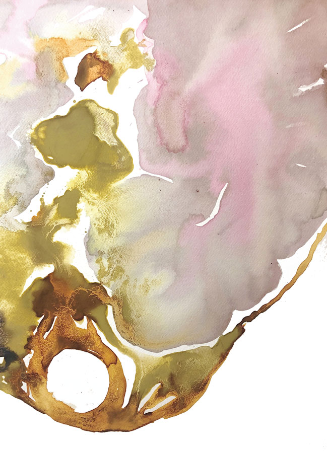 encres végétales fabriquées par l’artiste – grenade, thé matcha, rose rouge, prunellier – et rouille, sur papier aquarelle 300 g